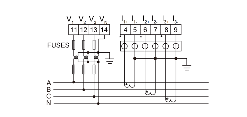| Masukan | Koneksi | Kabel fase tunggal 2, kabel 3 fase 3, kabel 3 fase 4 | ||